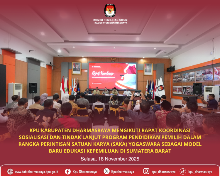 Pulau Punjung, kab-dharmasraya.kpu.go.id ,- Ketua KPU Kabupaten Dharmasraya (France Putra) didampingi Ketua Divisi Sosdiklih, Parmas dan SDM (Hanna Citra Utami TB) mengikuti Rapat Koordinasi Sosialisasi dan Tindak Lanjut Program Pendidikan Pemilih dalam rangka perintisan Satuan Karya (Saka) Yogaswara sebagai model baru edukasi kepemiluan di Sumatera Barat pada hari Selasa (18/11) di Aula KPU Provinsi Sumatera Barat. Kegiatan ini diselenggarakan oleh KPU Provinsi Sumatera Barat dengan menghadirkan Anggota KPU Republik Indonesia yang membidangi Divisi Sumber Daya Manusia, Organisasi, Pendidikan dan Pelatihan dan Penelitian dan Pengembangan (Parsadan Harahap, S.P., M.Si) memberikan arahan dan menyampaikan apresiasi atas inisiatif pembentukan Saka Yogaswara yang dinilai sebagai langkah strategis dan berpotensi menjadi program nasional. Parsadan menekankan bahwa Pramuka merupakan mitra ideal karena memiliki jaringan hingga ke tingkat dasar dan memiliki kedisiplinan organisasi yang selaras dengan nilai KPU. Menutup rapat koordinasi, Parsadaan mendorong seluruh KPU Kabupaten/Kota untuk tetap kreatif, memperluas jejaring pendidikan pemilih, memaksimalkan MoU yang telah dibangun dengan lembaga pendidikan dan memperkuat Kerjasama dengan Kwarda 03 Gerakan Pramuka Sumbar dalam memperkuat wawasan kepemiluan generasi muda serta meningkatkan partisipasi pemilih yang bekualitas ke depannya. ....