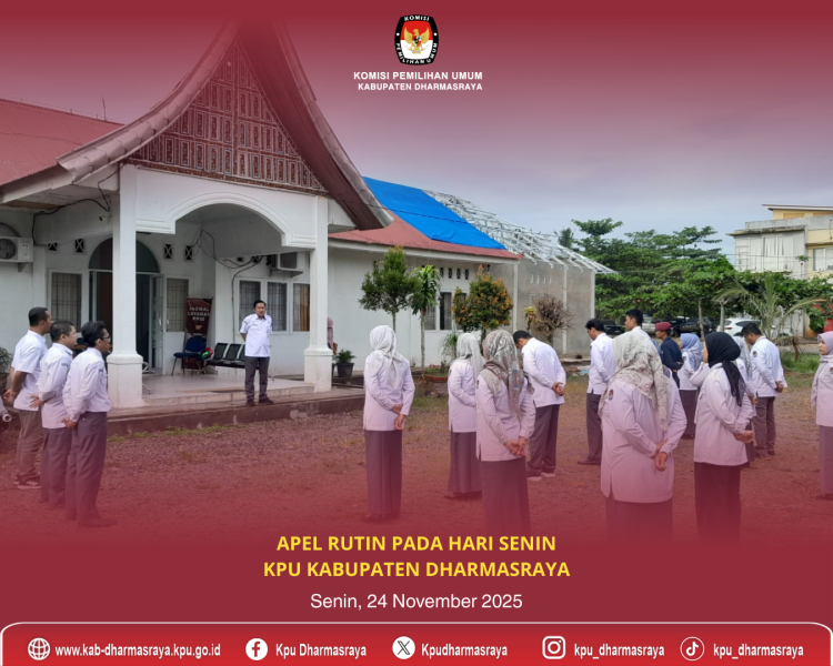 Pulau Punjung, kab-dharmasraya.kpu.go.id ,- Sekretariat KPU Kabupaten Dharmasraya melaksanakan Apel Rutin pada hari Senin, 24 November 2025 yang dipimpin oleh Sekretaris KPU Kabupaten Dharmasraya dan diikuti oleh para Kasubbag beserta staf Sekretariat KPU Kabupaten Dharmasraya. Dalam arahannya Amrullah selaku Sekretaris KPU Kabupaten Dharmasraya mengingatkan seluruh pegawai untuk selalu menjaga silaturahmi dan komunikasi yang baik sesama pegawai. Selanjutnya Amrullah menyampaikan agenda kegiatan Rapat Finalisasi Penyusunan Laporan Evaluasi Nasional Pelaksanaan Pemilihan Serentak Tahun 2024 oleh KPU RI melalui zoom meeting yang diikuti oleh KPU Provinsi dan KPU Kabupaten/ Kota se-Indonesia sampai tanggal 26 November 2025. ....