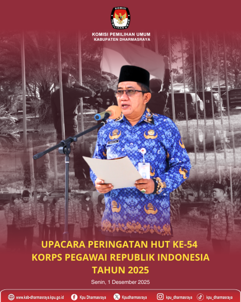 Pulau Punjung, kab-dharmasraya.kpu.go.id ,- KPU Kabupaten Dharmasraya melaksanakan upacara Peringatan Hari Ulang Tahun Ke- 54 Korps Pegawai (KORPRI) Republik Indonesia Tahun 2025 pada hari Senin, 1 Desember 2025 bertempat di halaman kantor KPU Kabupaten Dharmasraya. Bertindak selaku Pembina Upacara Sekretaris KPU Kabupaten Dharmasraya (Amrullah, S.T., MM). Upacara diikuti oleh seluruh pegawai ASN di lingkungan KPU Kabupaten Dharmasraya. Peringatan Hari Ulang Tahun Ke- 54 KORPRI Tahun 2025 mengangkat tema “Bersatu, Berdaulat, Bersama KORPRI, Dalam Mewujudkan Indonesia Maju”. Dalam amanatnya yang dibacakan oleh Amrullah, Ketua Umum Dewan Pengurus KORPRI Nasional mengajak pengurus dan anggota KORPRI agar menjalankan program utama KORPRI yang mencakup peningkatan kualitas pelayanan publik, digitalisasi birokrasi, penguatan ideologi ASN, perlindungan karir, bantuan hukum, dan peningkatan kesejahteraan, serta peka terhadap masyarakat lingkungan kerjanya. Selain itu diminta supaya anggota KORPRI mengembangkan diri dengan memperhatikan teknologi (Artificial Intelligence), IOT (Internet Of Thing), Big Data, Sistem dan Algoritma Pemrograman, Coding, maupun Verifikasi Biometrik sehingga mampu menyelesaikan permasalahan dengan metode sesuai perkembangan zaman. Dalam memperingati Hari Ulang Tahun Ke-54 Tahun 2025 KORPRI diuji soliditas dan kebersamaannya, dikarenakan tahun 2025 ini tercatat ada 10 kejadian bencana, pertama banjir dan tanah longsor di Pekalongan Jawa Tengah, banjir di Demak Jawa Tengah, banjir di Jabodetabek, gempa bumi di Bengkulu, kebakaran hutan dan lahan di Sulawesi Selatan, tanah longsor di Banjarnegara, erupsi Gunung Semeru, serta kejadian bencana yang baru saja terjadi yaitu banjir dan longsor di Aceh, Sumatera Barat dan Sumatera Utara. KORPRI akan selalu hadir untuk turut membantu dan meringankan beban kepada saudara-saudara yang mengalami bencana tersebut ....
