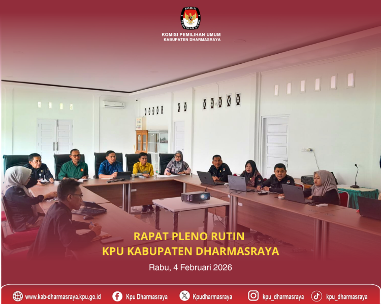 Pulau Punjung, kab-dharmasraya.kpu.go.id ,- KPU Kabupaten Dharmasraya menggelar Rapat Pleno pada Rabu, 4 Februari 2026, di Kantor KPU Kabupaten Dharmasraya. Rapat pleno dipimpin oleh Ketua KPU Kabupaten Dharmasraya (France Putra) dan dihadiri Anggota KPU Kabupaten Dharmasraya, Sekretaris KPU Kabupaten Dharmasraya, para Kasubbag dan staf terkait. Rapat Pleno membahas terkait Finalisasi Laporan Lembar Kerja Sistem Pengendalian Intern Pemerintah (SPIP) Periode Januari Tahun 2026, tindak lanjut hasil rapat sebelumnya, penyampaian laporan tugas lainnya secara periodik serta penyampaian administrasi persuratan. ....
