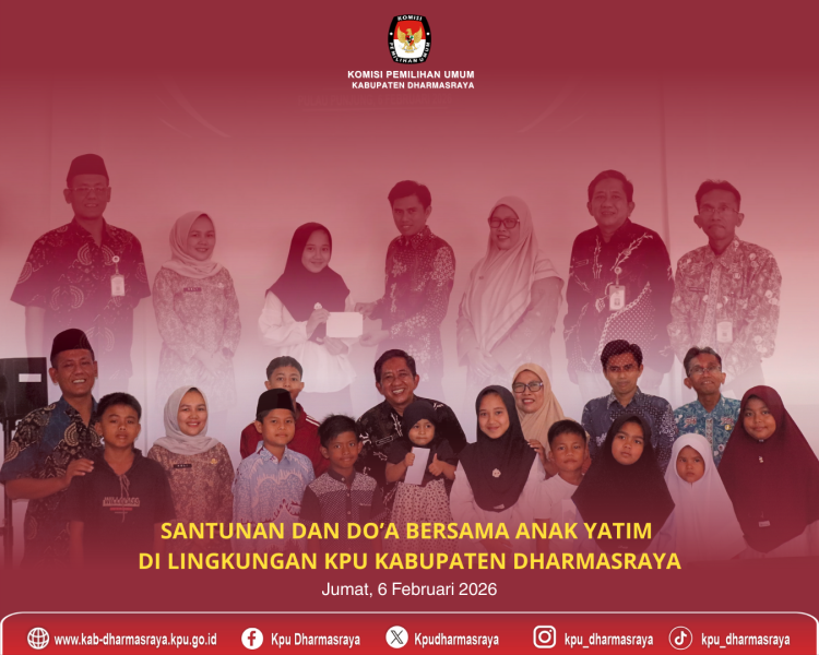 Pulau Punjung, kab-dharmasraya.kpu.go.id ,- Dalam rangka bentuk kepedulian kepada generasi bangsa dan mempererat silaturahmi serta meningkatkan solidaritas antar sesama, Komisi Pemilihan Umum Kabupaten Dharmasraya melaksanakan kegiatan Santunan dan Do’a Bersama Anak Yatim untuk Menyambut Bulan Suci Ramadhan di lingkungan KPU Kabupaten Dharmasraya. Kegiatan yang digelar pada hari Jumat, 6 Februari 2026, bertempat di kantor KPU Kabupaten Dharmasraya diikuti sebanyak 10 orang anak yatim/piatu. Dalam kesempatan ini, Wilri Iswandi selaku Ketua Divisi Perencanaan, Data dan Infromasi KPU Kabupaten Dharmasraya menguatkan semangat anak-anak yatim dengan menekankan pentingnya memiliki ilmu, akhlak dan iman. Turut hadir dalam kegiatan ini Ketua Divisi Teknis Penyelenggaraan Pemilu (Henny Wardany), Sekretaris KPU Kabupaten Dharmasraya (Amrullah) beserta para Kasubbag dan staf Sekretariat KPU Kabupaten Dharmasraya. ....