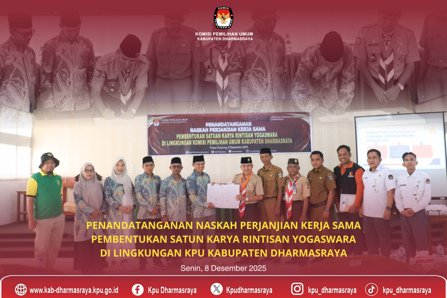 Pulau Punjung, kab-dharmasraya.kpu.go.id ,- KPU Kabupaten Dharmasraya melakukan Penandatanganan Naskah Perjanjian Kerja Sama Pembentukan Saka (Satuan Karya) Pramuka Rintisan Yogaswara Bersama Kwartir Cabang 18 Gerakan Pramuka Kabupaten Dharmasraya pada hari Senin (8/12) di Aula Kampus III Universitas Andalas Dharmasraya.