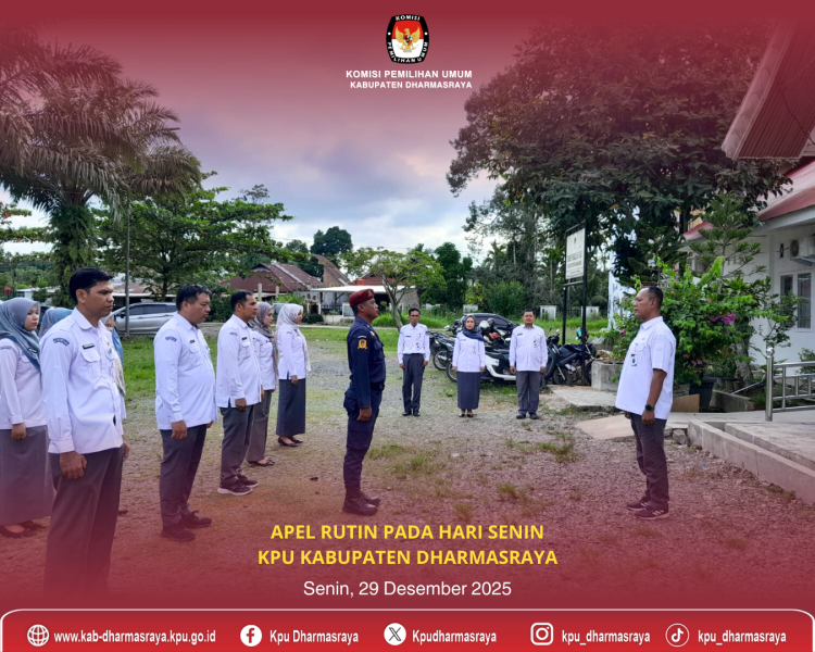 Pulau Punjung, kab-dharmasraya.kpu.go.id ,- KPU Kabupaten Dharmasraya melaksanakan apel pagi pada Senin, 29 Desember 2025 yang dipimpin oleh Plh. Sekretaris KPU Kabupaten Dharmasraya (Iwan Prasetyo) dan diikuti oleh para Kasubbag beserta pegawai Sekretariat KPU Kabupaten Dharmasraya.