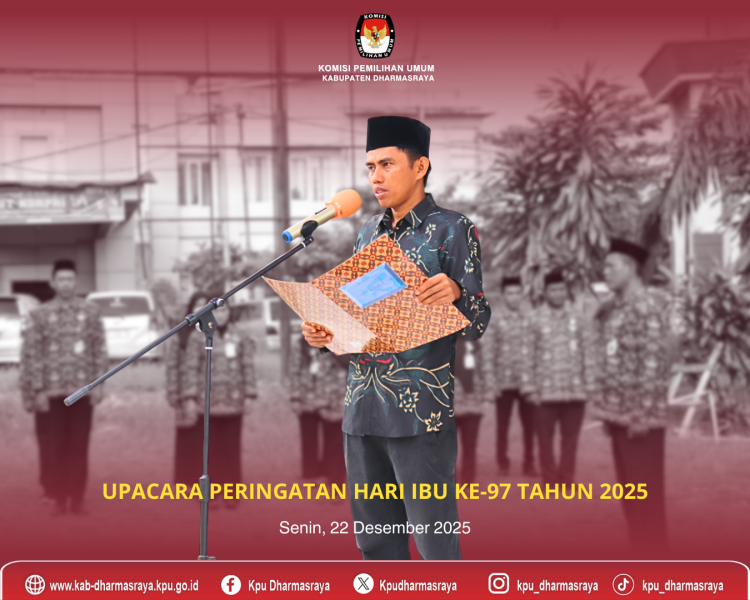 Pulau Punjung, kab-dharmasraya.kpu.go.id ,- KPU Kabupaten Dharmasraya melaksanakan upacara Peringatan Hari Ibu ke-97 Tahun 2025 pada hari Senin, 22 Desember 2025 bertempat di halaman kantor KPU Kabupaten Dharmasraya. Bertindak selaku Inspektur Upacara Ketua Divisi Perencanaan, Data dan Infromasi KPU Kabupaten Dharmasraya (Wilri Iswandi). Peringatan Hari Ibu ke-97 Tahun 2025 mengangkat tema “Perempuan Berdaya dan Berkarya, Menuju Indonesia Emas 2045”. Tema ini menjadi pengingat bahwa perempuan Indonesia ditegaskan bukan hanya sebagai penerima manfaat pembangunan, melainkan salah satu motor utama perubahan di berbagai sektor, termasuk dalam kancah politik dan pemerintahan.