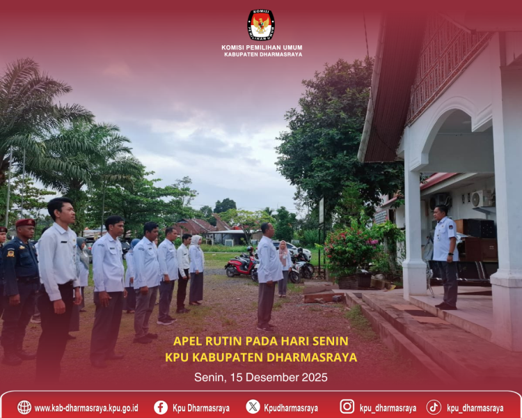 Pulau Punjung, kab-dharmasraya.kpu.go.id ,- KPU Kabupaten Dharmasraya melaksanakan apel pagi pada Senin, 15 Desember 2025 yang dipimpin oleh Sekretaris KPU Kabupaten Dharmasraya (Amrullah) diikuti oleh seluruh pegawai sekretariat. Apel pagi tersebut berlangsung sebagai bagian dari rutinitas kerja dan sarana penyampaian arahan pimpinan kepada jajaran pegawai.
