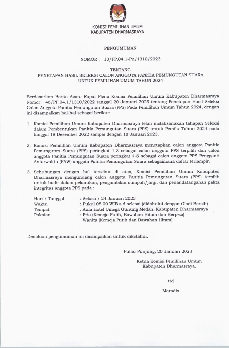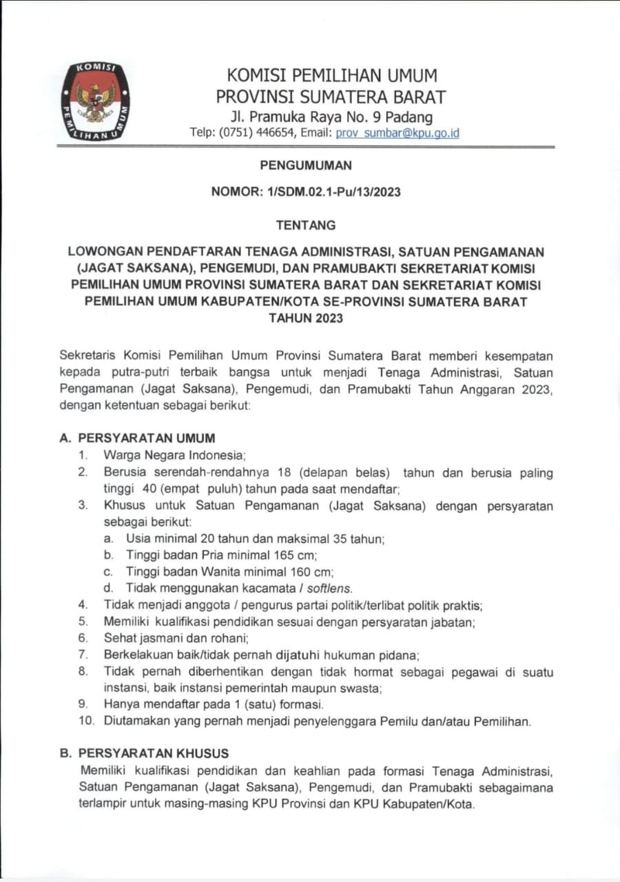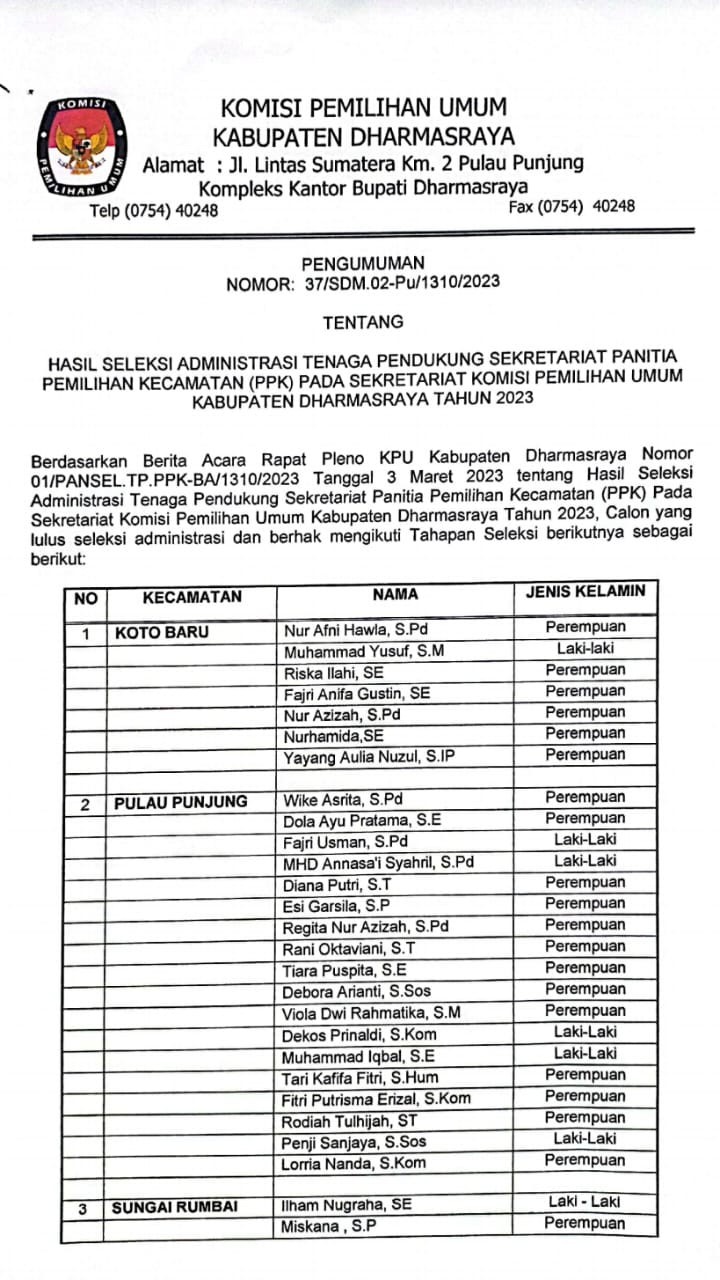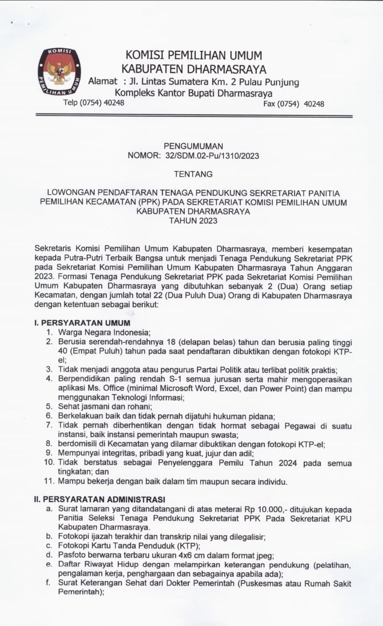 Berikut kami sampaikan Pengumuman Pendaftaran Tenaga Pendukung Sekretariat Panitia Pemilihan kecamatan (PPK) Pada Sekretariat Komisi Pemilihan Umum Kabupaten Dharmasraya Tahun 2023.