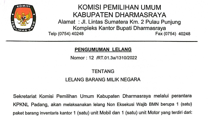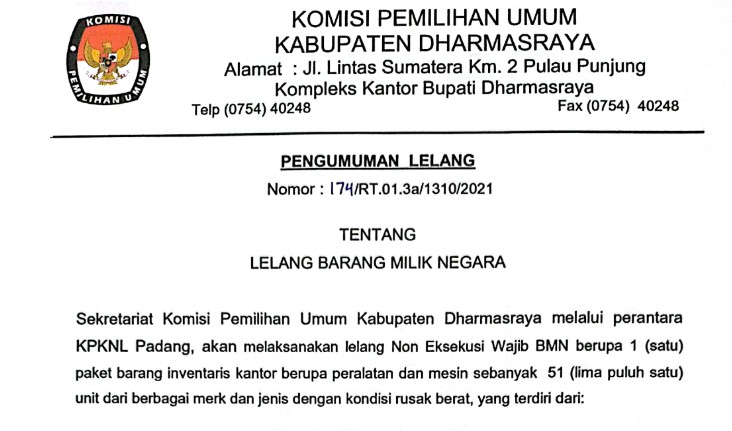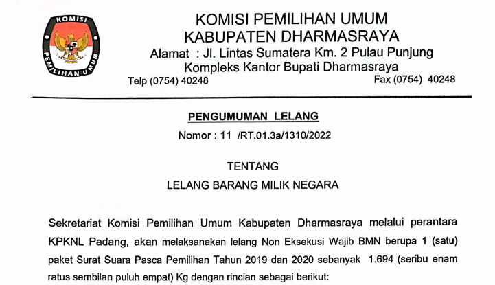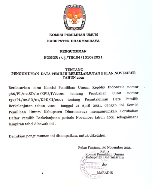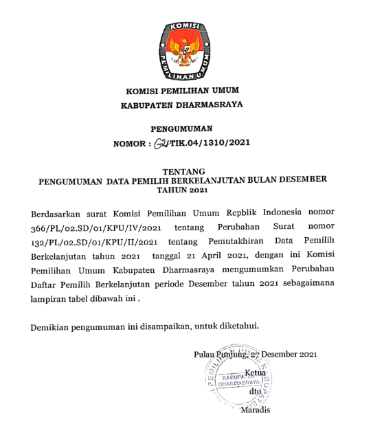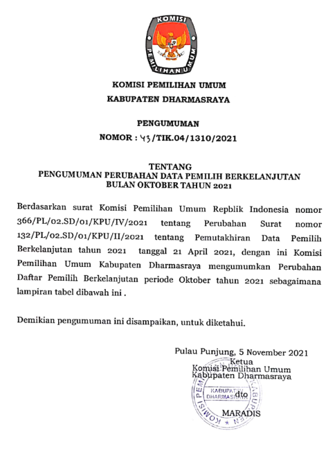 Berdasarkan surat Komisi Pemilihan Umum Republik Indonesia NOmor 366/PL/02.SD/01/KPU/IV/2021 tentang perubahan surat nomor 132/PL/02.SD/01/KPU/II/2021 tentang Pemutakhiran Data Pemilih Berkelanjutan tahun 2021 tanggal 21 April 2021, dengan ini Komisi Pemilihan Umum Kabupaten Dharmasraya mengumumkan Perubahan Daftar Pemilih berkelanjutan periode November tahun 2021 lampiran tabel dibawah ini.