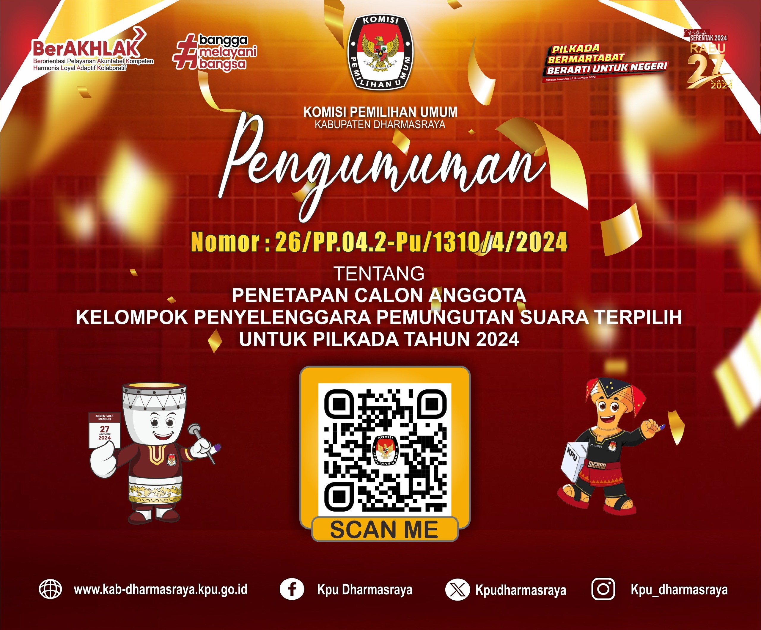 Berikut Pengumuman nomor : 26/PP.04.2-Pu/1310/4/2024 tentang Penetapan Calon Anggota Kelompok Penyelenggara Pemungutan Suara Terpilih untuk Pilkada Tahun 2024.
