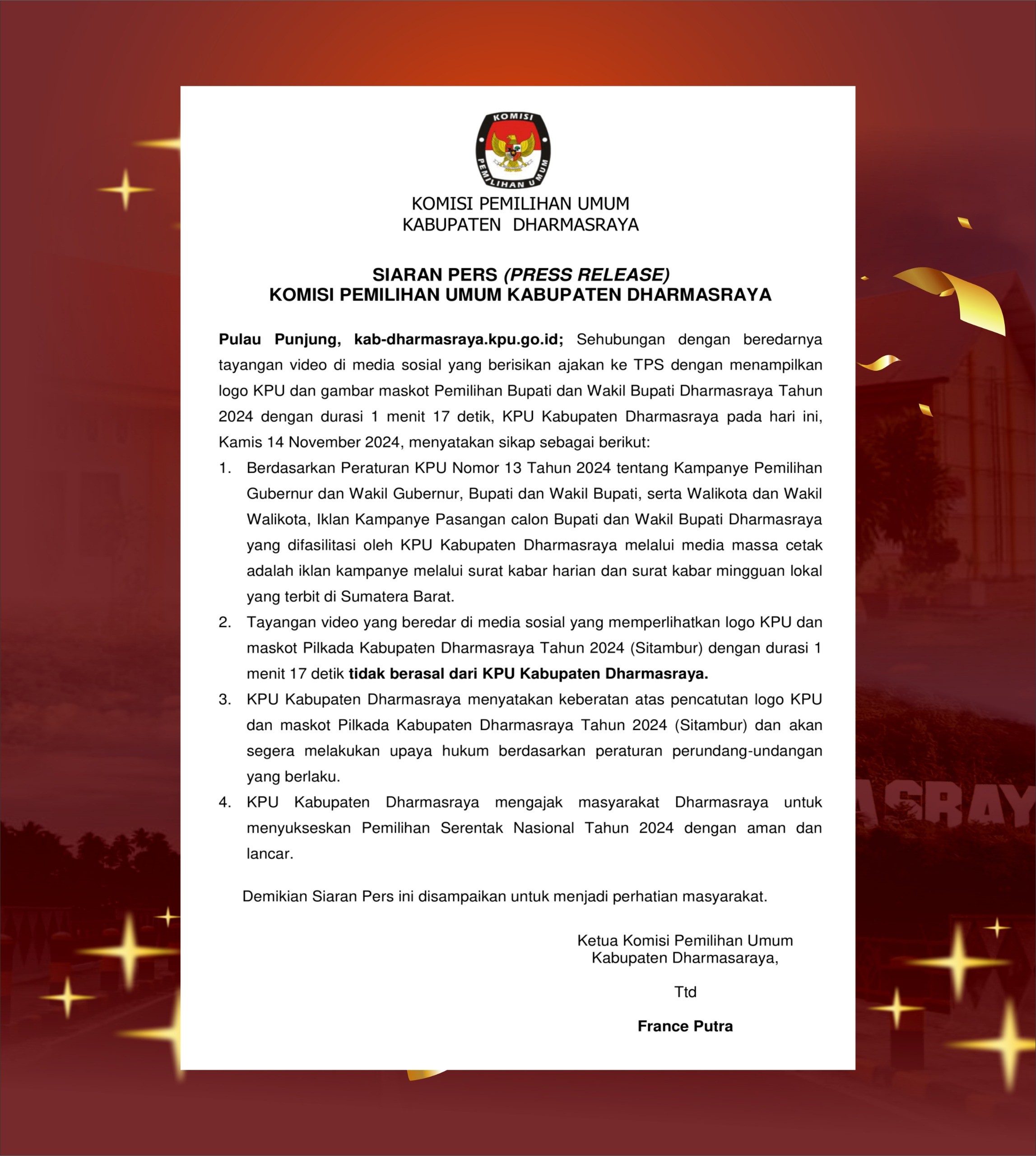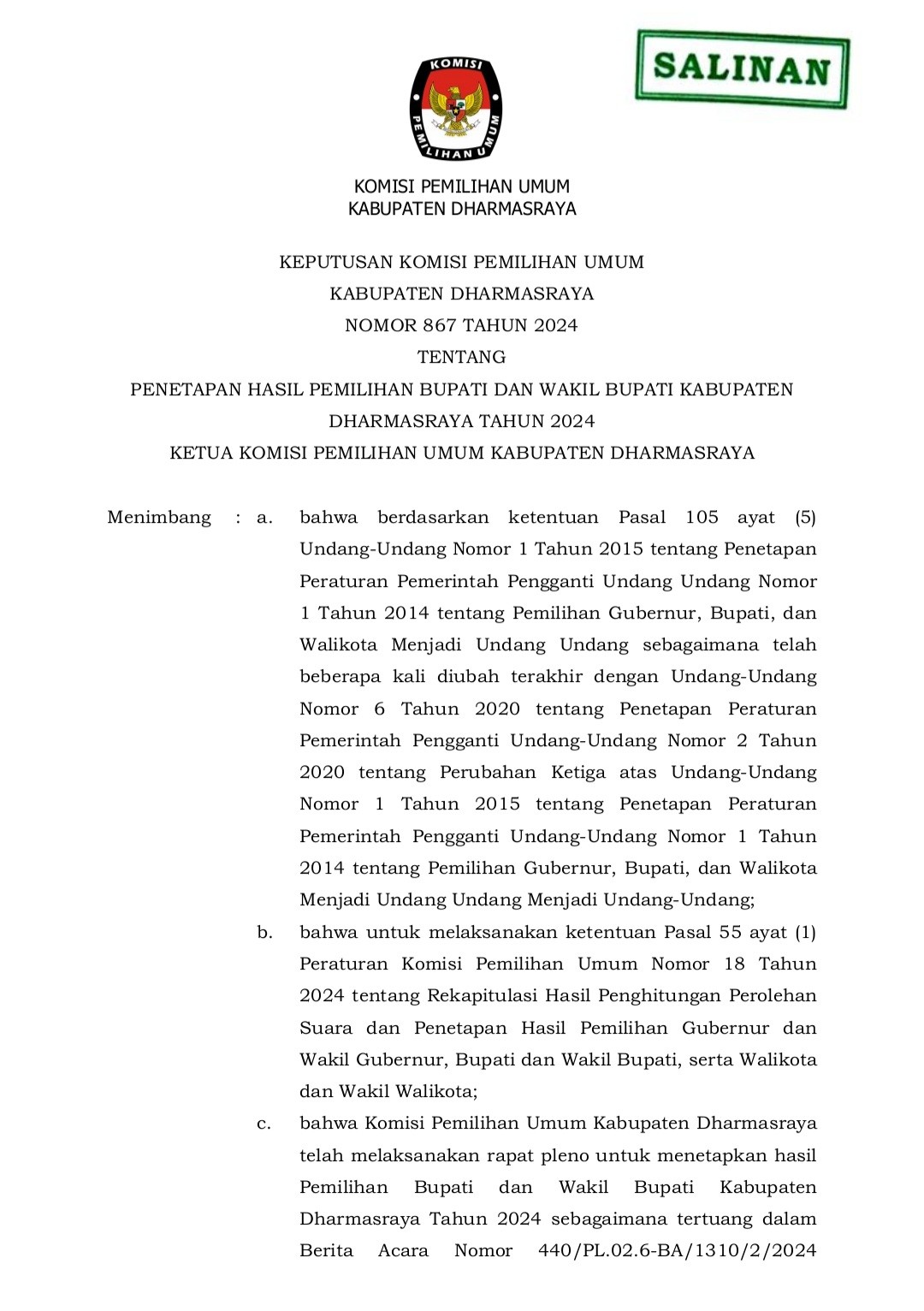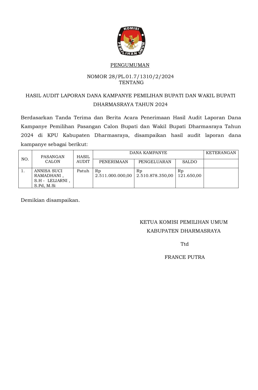 Berikut Pengumuman Nomor 28/PL.01.7/1310/2/2024 Tentang Hasil Audit Laporan Dana Kampanye Pemilihan Bupati dan Wakil Bupati Dharmasraya Tahun 2024.
