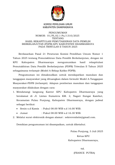 Berikut Pengumuman Nomor 01/PL.02.1-Pu/1310/2025 Tentang Hasil Rekapitulasi Pemutakhiran Data Pemilih Berkelanjutan (PDPB) KPU Kabupaten Dharmasraya pada Triwulan II Tahun 2025.