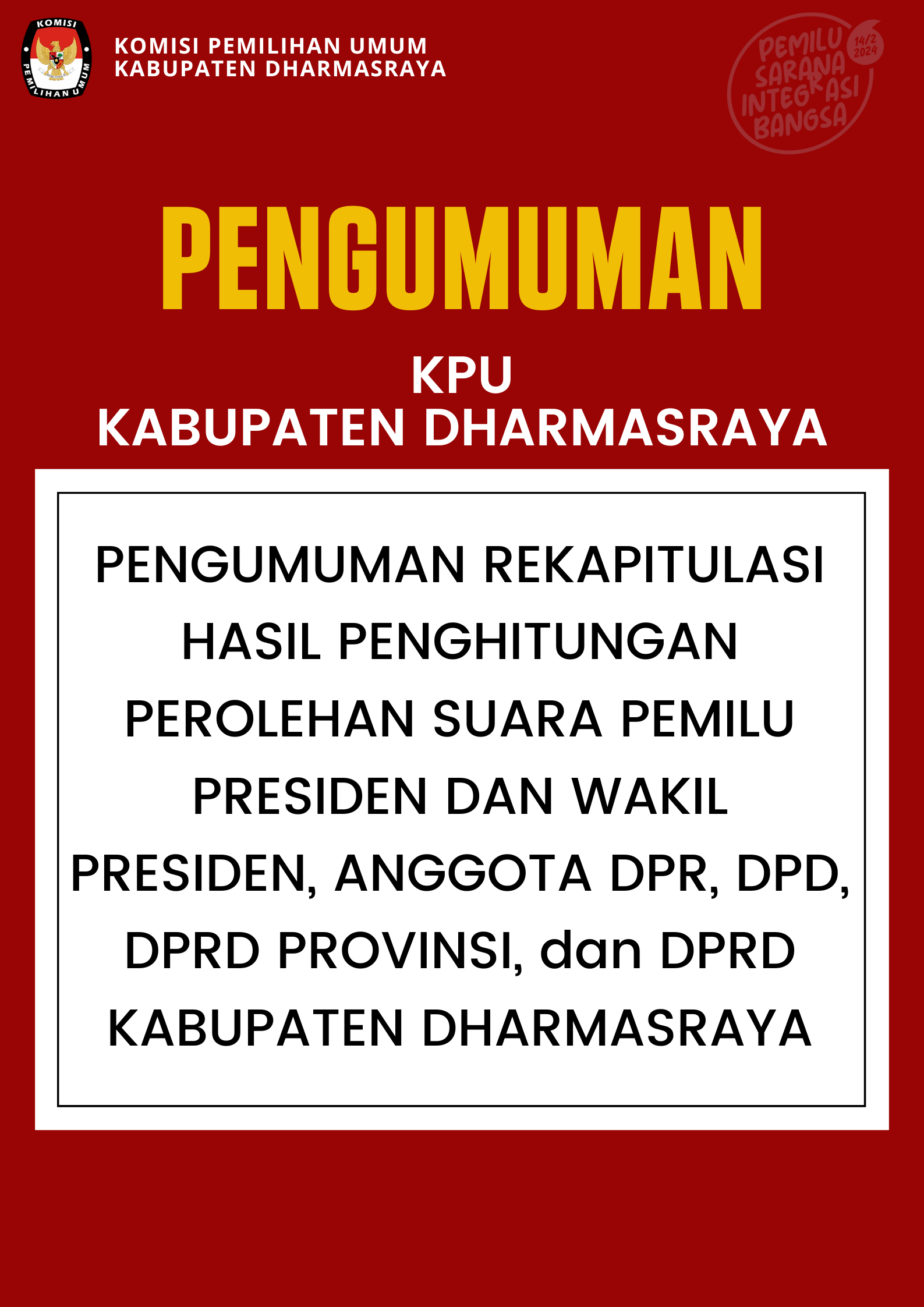 PENGUMUMAN REKAPITULASI HASIL PENGHITUNGAN PEROLEHAN SUARA PEMILU PRESIDEN DAN WAKIL PRESIDEN, ANGGOTA DPR, DPD, DPRD PROVINSI, dan DPRD KABUPATEN DHARMASRAYA PEMILIHAN UMUM TAHUN 2024.