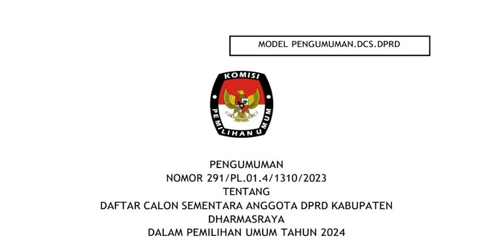 Bahwa untuk melaksanakan ketentuan Pasal 70 Peraturan KPU Nomor 10 Tahun 2023 tentang Pencalonan Anggota Dewan Perwakilan Rakyat, Dewan Perwakilan Rakyat Daerah Provinsi, dan Dewan Perwakilan Rakyat Daerah Kabupaten/Kota, KPU Kabupaten Dharmasraya mengumumkan Daftar Calon Sementara (DCS) Anggota DPRD Kabupaten Dharmasraya dan proporsi keterwakilan perempuan dalam Daftar Calon Sementara (DCS) sebagaimana terlampir. Berkenaan dengan hal tersebut, sesuai dengan ketentuan Pasal 71 Peraturan KPU Nomor 10 Tahun 2023 tentang Pencalonan Anggota Dewan Perwakilan Rakyat, Dewan Perwakilan Rakyat Daerah Provinsi, dan Dewan Perwakilan Rakyat Daerah Kabupaten/Kota, bahwa masyarakat dapat menyampaikan masukan dan tanggapan terhadap calon sementara Anggota DPR , DPRD provinsi,