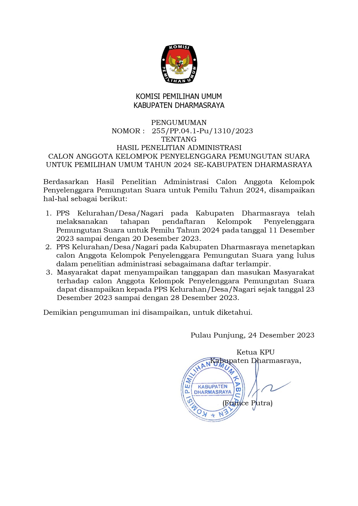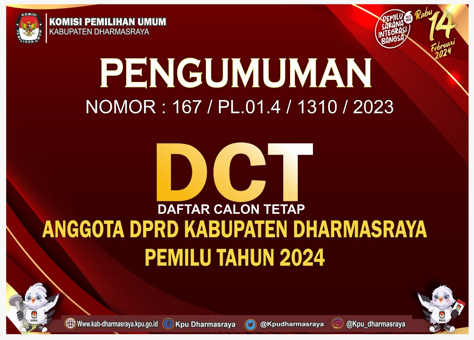 Dikeluarkan di Kantor KPU Kabupaten Dharmasrayapada tanggal 18 Agustus 2023.